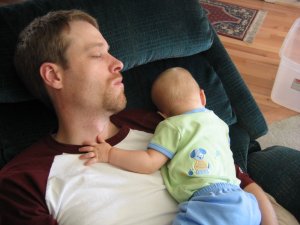 For the last few months, Reece has been primarily a momma’s boy, and Lorelai liked to hang out with Daddy. Well taking a really long weekend at Labor Day, Reece and I did a little bonding, and now, he seems to like going to sleep with Daddy, just as much as Mommy. Well, maybe not as much, since Daddy doesn’t have boobs, but at least Daddy’s chest is flat enough to get some good shut eye. Thank god I don’t have real pecs.