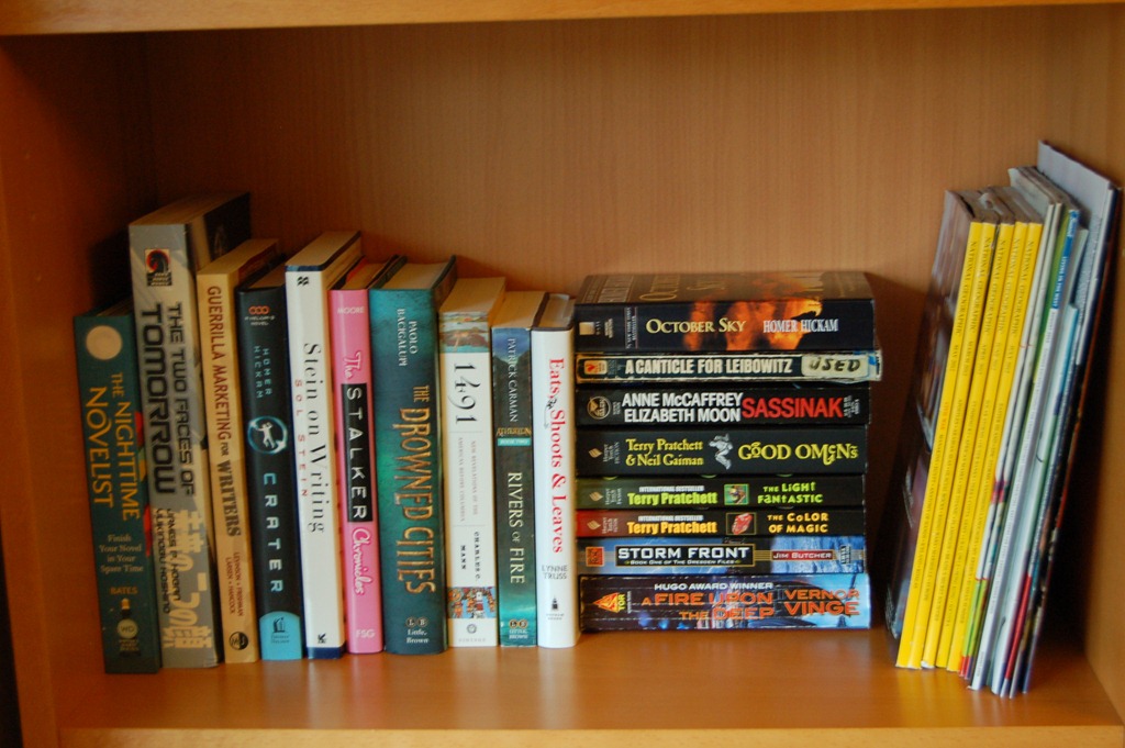 Here’s a quick picture of my current shelf. Of course I can’t take a picture of all the books on the Kindle, nor have I really looked, but I’ve seen the frequent charges to our Amazon account, so I anticipate a bit of a shock when I finally do chance a gander.